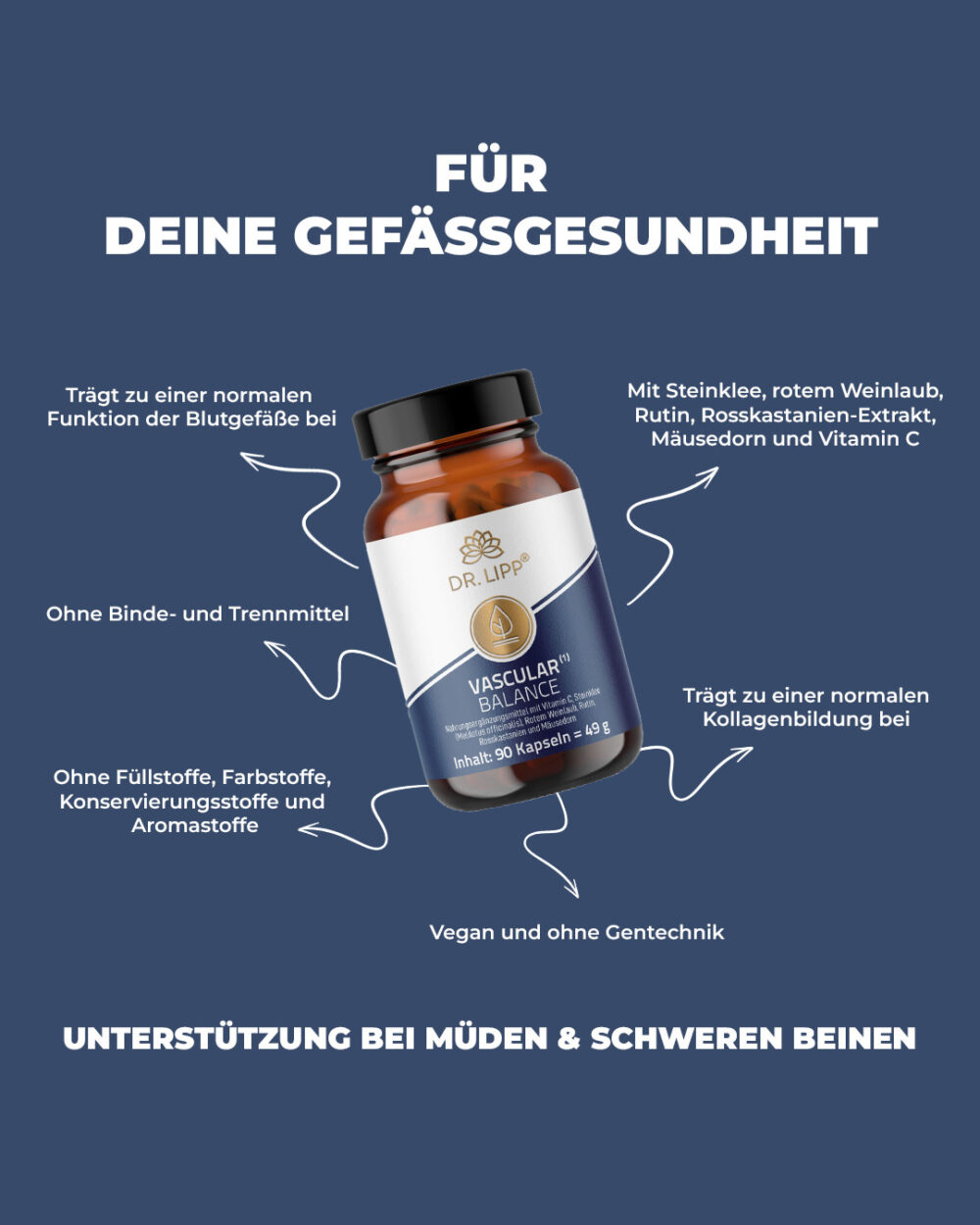 Der Vascular-Balance-Complex kann Sie dabei ernährungsphysiologisch unterstützen. Enthalten sind zahlreiche ausgewählte gesunde Pflanzenstoffe, deren positive Wirkung in der Pflanzenheilkunde, der Ayurveda und der traditionellen Chinesischen Medizin bei den genannten Symptomen bevorzugt zur Andwendung kommen. 1Vitamin C trägt zu einer normalen Kollagenbildung für eine normale Funktion der Blutgefäße bei.